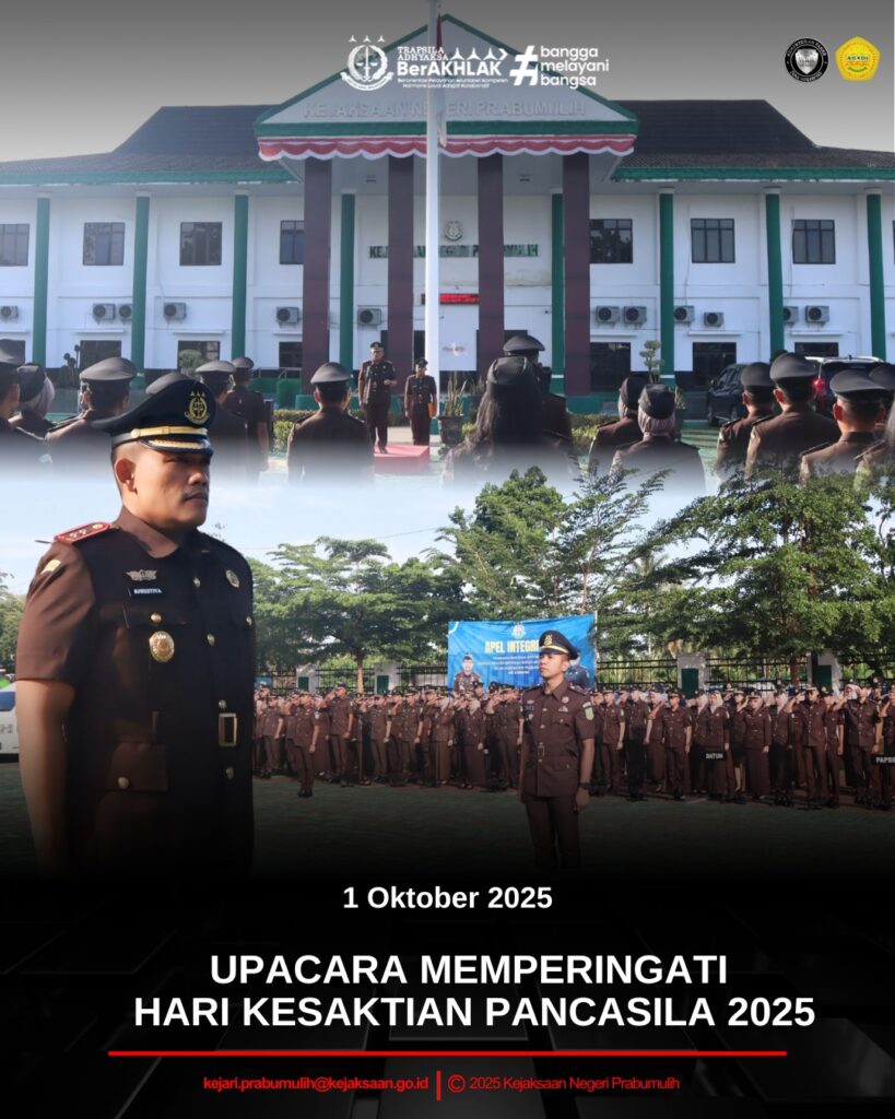 Bertempat di halaman Kantor Kejaksaan Negeri Prabumulih, Kepala Kejaksaan Negeri Prabumulih Bapak Khristiya Lutfiasandhi, S.H., M.H., bertindak sebagai Inspektur Upacara dalam rangka memperingati Hari Kesaktian Pancasila. Upacara tersebut diikuti oleh seluruh Kepala Seksi, Kasubagbin, serta seluruh pegawai Kejaksaan Negeri Prabumulih.