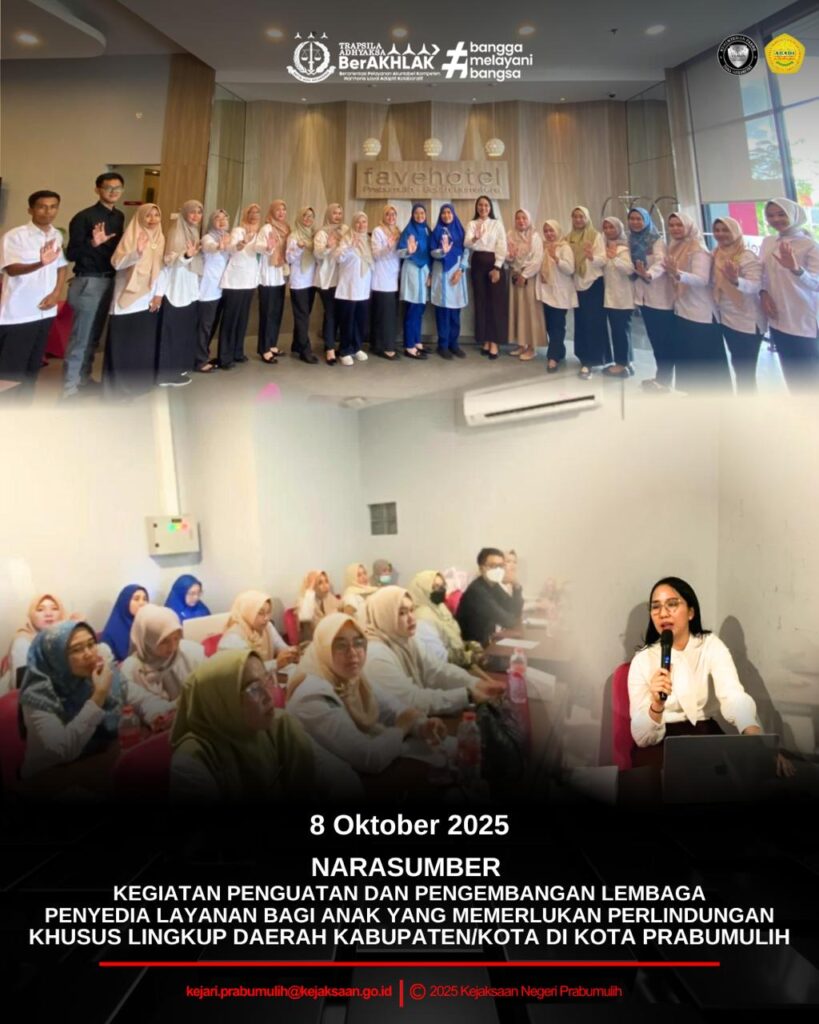 Bertempat di Fave Hotel Kota Prabumulih, Plh. Kasubsi I Intelijen, Ibu Intan Magdalena, S.H., bersama Kasubsi II Intelijen, Ibu Meylda Pegasari, S.H., menjadi narasumber dalam kegiatan Penguatan dan Pengembangan Lembaga Penyedia Layanan bagi Anak yang Memerlukan Perlindungan Khusus lingkup daerah kabupaten/kota di Kota Prabumulih.