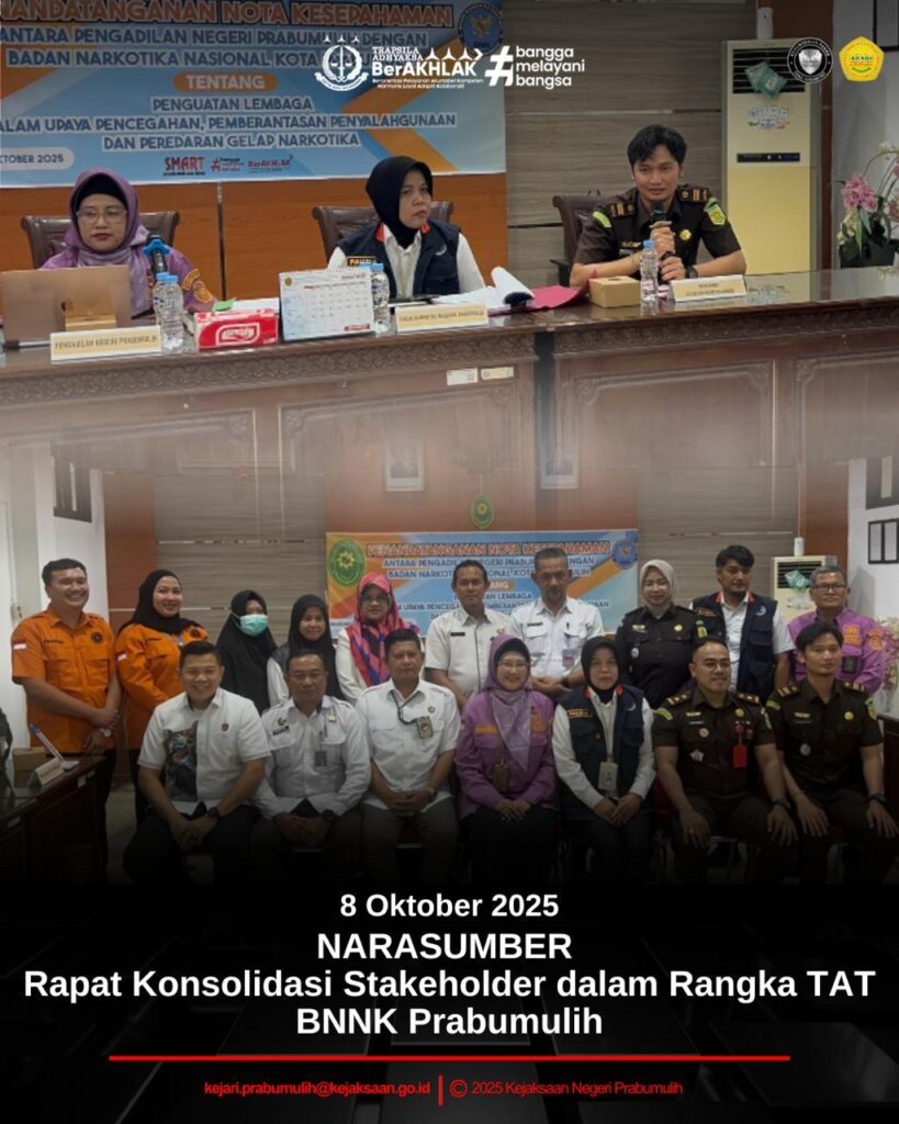 Bertempat di Ruang Rapat Pengadilan Negeri Prabumulih, Kasubsi Pra Penuntutan Bidang Tindak Pidana Umum, Muhammad Ilham , S.H.,M.H., bersama Kasubsi Penuntutan Bidang Tindak Pidana Umum Ibu Khilluwa Nadhifa, S.H., menjadi narasumber dalam Rapat Konsolidasi Stakeholder dalam rangka TAT BNNK Prabumulih.