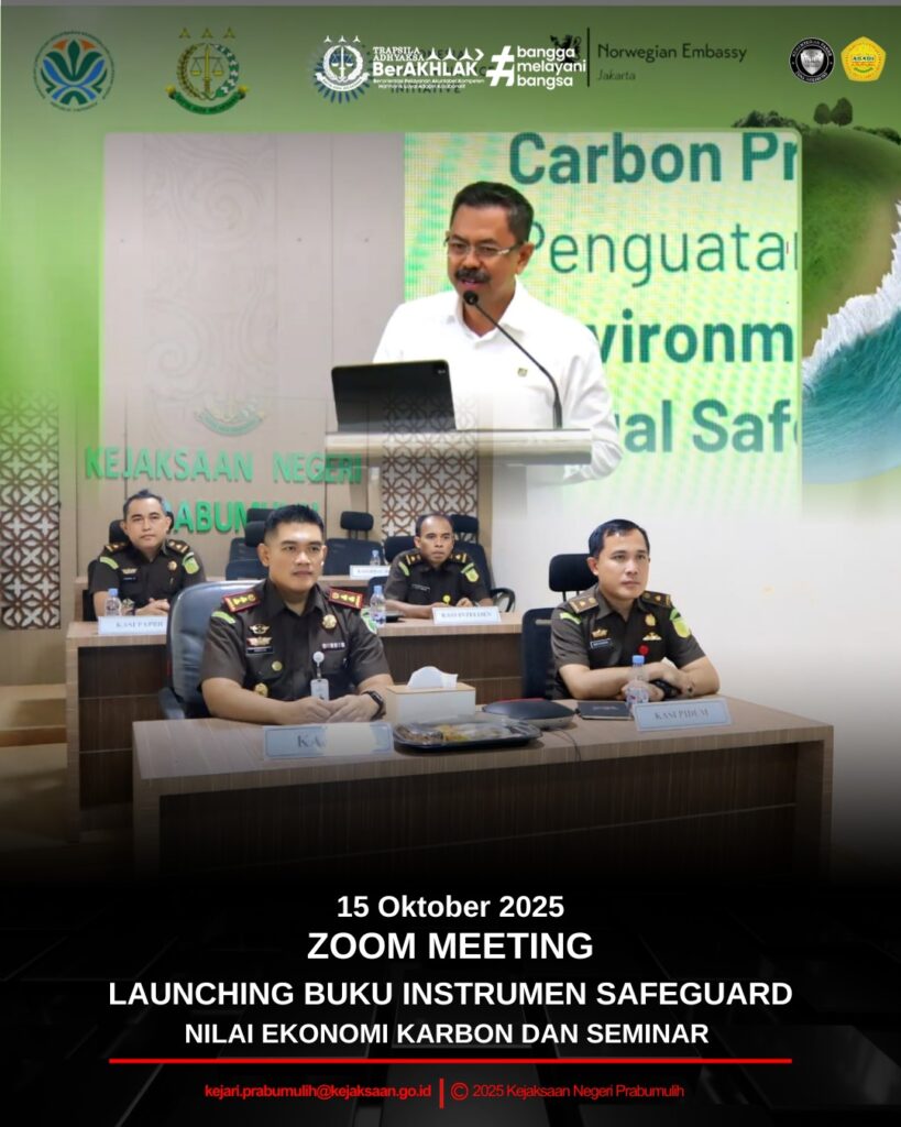 Kepala Kejaksaan Negeri Prabumulih Bapak Khristiya Lutfiasandhi, S.H.,M.H., didampingi Kepala Seksi Tindak Pidana Umum Bapak Mirsyah Rizal, S.H.,M.H., Kepala Seksi PAPBB, dan Kasubagbin Bapak I.K Wirasa, S.H., mengikuti Launching Buku Instrumen Safeguard Nilai Ekonomi Karbon dan Seminar secara Zoom Meeting.