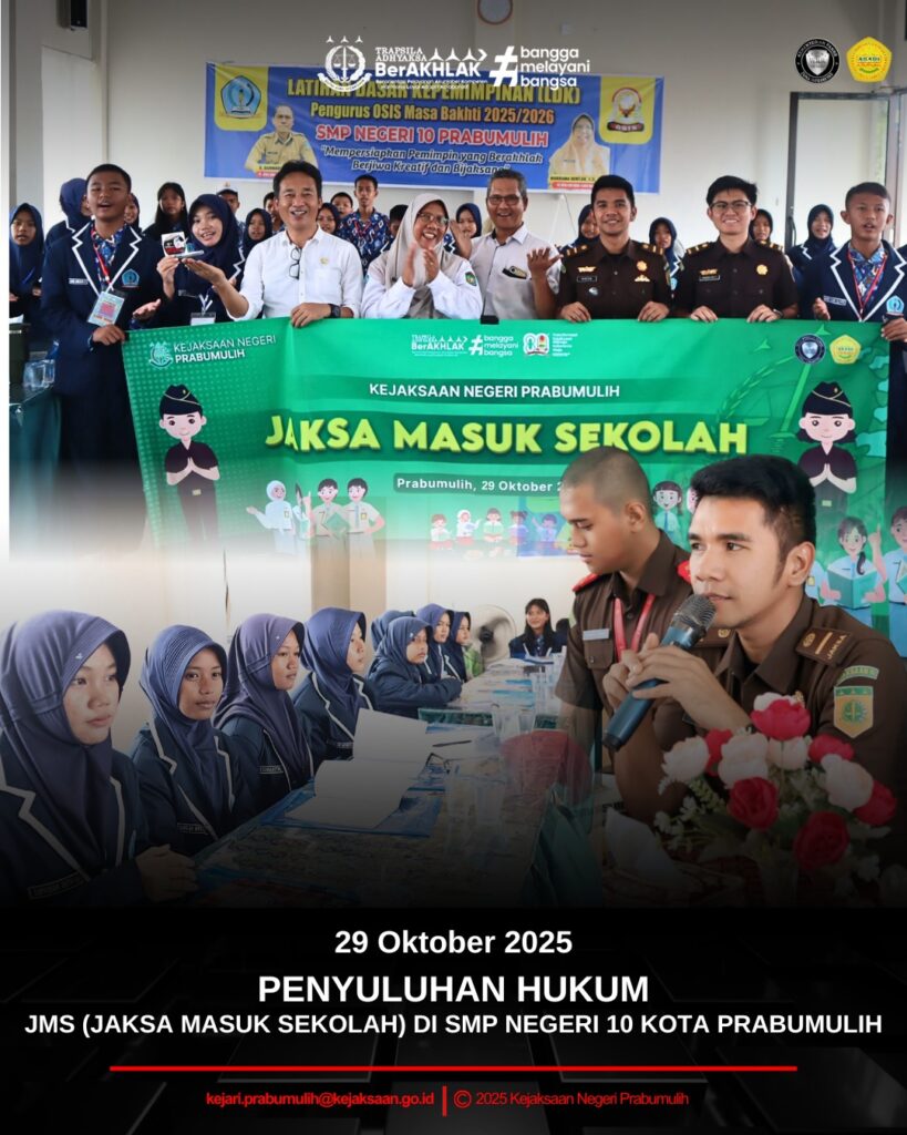 Jaksa pada Bidang Intelijen Bapak Rozza Syaputra, S.H., dan Bapak Hendro Adi Syahputra, S.H., melakukan Penyuluhan Hukum JMS (Jaksa Masuk Sekolah) di SMP Negeri 10 Kota Prabumulih.