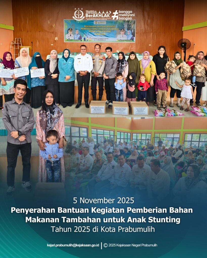 Bertempat di Gedung Balai Karya Kelurahan Pasar II Kecamatan Prabumulih Utara Kota Prabumulih, Kepala Seksi Intelijen Bapak Ajie Martha, S.H., menghadiri acara Penyerahan Bantuan Kegiatan Pemberian Bahan Makanan Tambahan untuk Anak Stunting dan Bantuan Desa B2SA Tahun 2025.