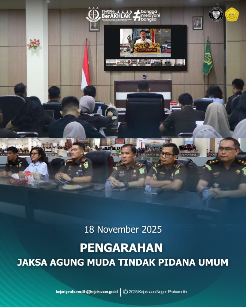 Bertempat di Aula Kantor Kejaksaan Negeri Prabumulih, Kepala Kejaksaan Negeri Prabumulih Bapak Khristiya Lutfiasandhi, S.H.,M.H., bersama Para Kepala Seksi serta Jaksa Fungsional pada Kejaksaan Negeri Prabumulih mengikuti Pengarahan dari Jaksa Agung Muda Tindak Pidana Umum Bapak Prof. Dr. Asep Nana Mulyana, S.H., M.Hum., secara daring melalui Zoom Meeting.