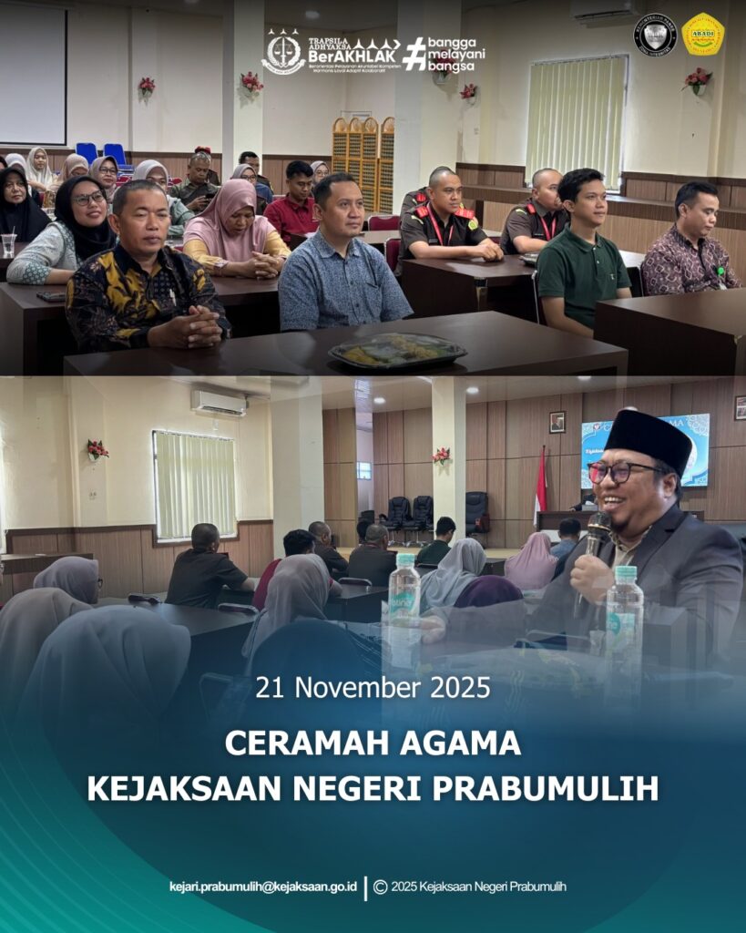Bertempat di Aula Kejaksaan Negeri Prabumulih telah dilaksanakan kegiatan ceramah agama yang diikuti oleh Kasubagbin serta Seluruh Pegawai pada Kejaksaan Negeri Prabumulih.