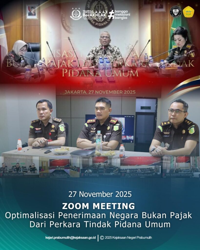 Kepala Kejaksaan Negeri Prabumulih Bapak Khristiya Lutfiasandhi, S.H.,M.H., didampingi Kepala Seksi Tindak Pidana Umum Bapak Mirsyah Rizal, S.H.,M.H., dan Kepala Seksi PAPBB Bapak Faisal Basni, S.H.,M.H., mengikuti Sosialisasi Optimalisasi Penerimaan Negara Bukan Pajak Dari Perkara Tindak Pidana Umum secara Zoom Meeting.