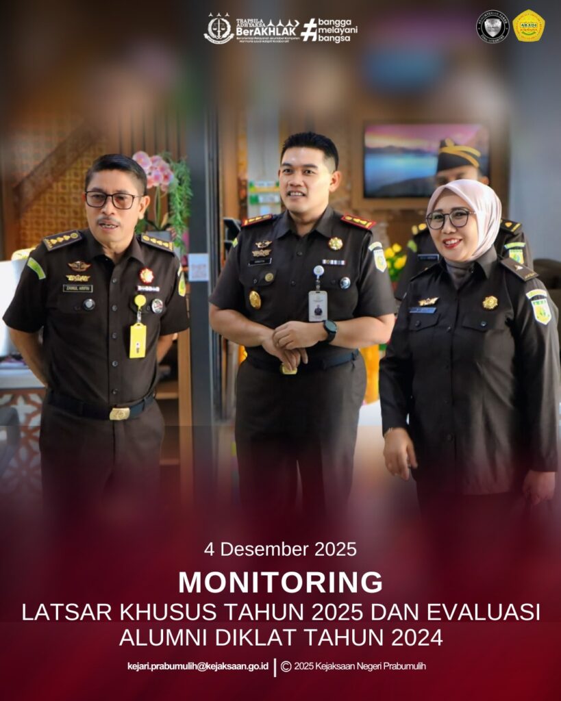 Bahwa dalam Kunjungan tersebut Tim Monitoring Latsar Khusus Tahun 2025 dan Evaluasi Alumni Diklat Latsar Tahun 2024 didampingi oleh Asisten Pembinaan Kejaksaan Tinggi Sumatera Selatan Bapak Zainul Arifin, S.H.,M.H. dan jajaran.