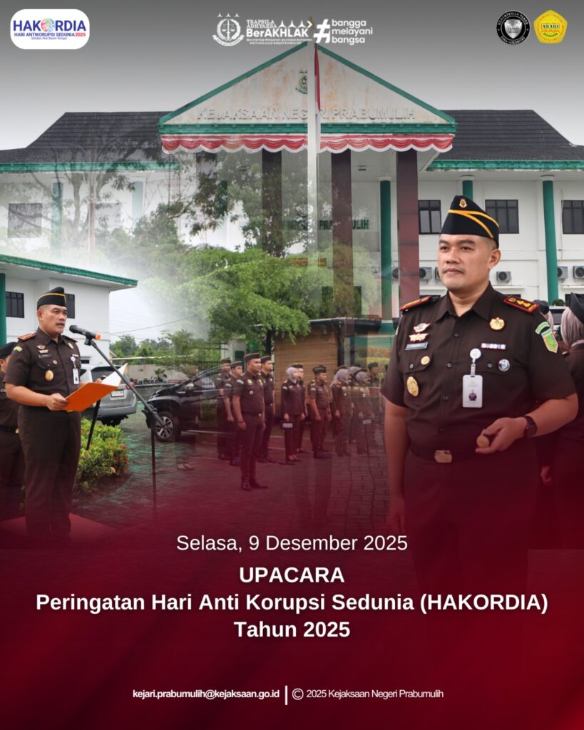 Bertempat di Halaman Kantor Kejaksaan Negeri Prabumulih, Kepala Kejaksaan Negeri Prabumulih Bapak Khristiya Lutfiasandhi, S.H., M.H., bertindak sebagai Inspektur Upacara pada Upacara Peringatan Hari Anti Korupsi Sedunia (HAKORDIA) Tahun 2025 yang diikuti para Kepala Seksi,Kasubag Pembinaan dan Pegawai pada Kejaksaan Negeri Prabumulih.