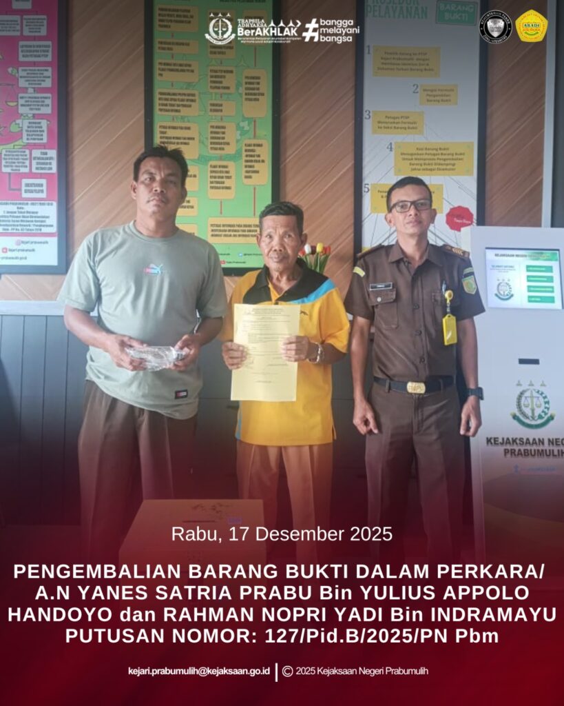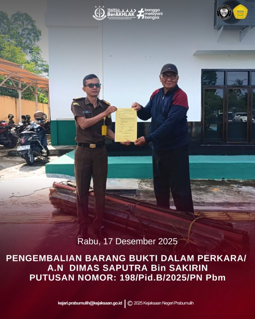 Kejari Prabumulih pada Bidang Pemulihan Aset dan Pengelolaan Barang Bukti (PAPBB) telah melaksanakan Pengembalian Barang Bukti berdasarkan: