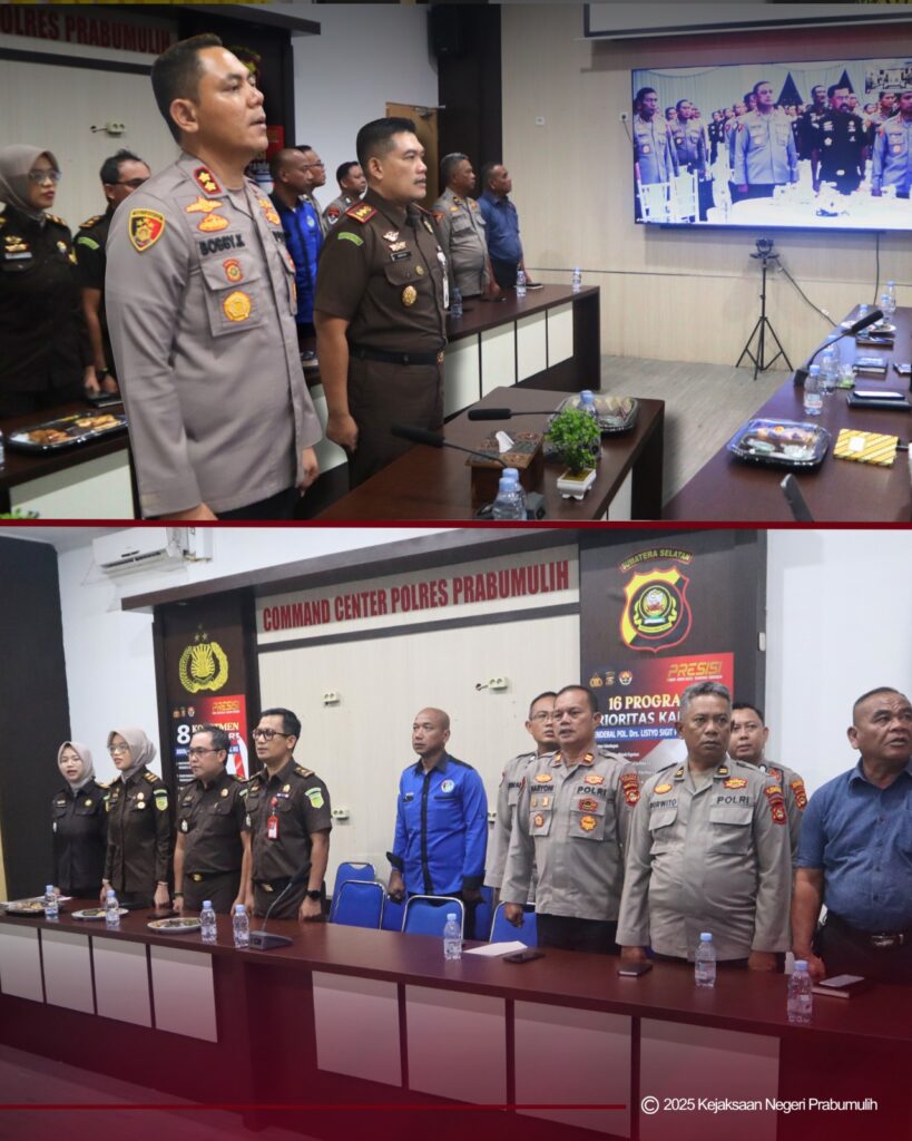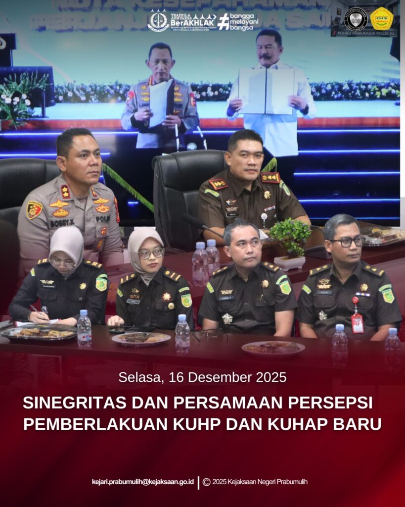 Bertempat di Aula Polres Prabumulih, Kepala Kejaksaan Negeri Prabumulih Bapak Khristiya Lutfiasandhi, S.H., M.H., bersama Kepala Seksi Tindak Pidana Khusus Bapak Safe’i, S.H., M.H., Kepala Seksi PAPBB Bapak Faisyal Basni, S.H., M.H., serta Kasubsi Penuntutan Ibu Khiluwa Nadhifah, S.H., dan Jaksa pada Seksi Tindak Pidana Umum, bersama Kepala Kepolisian Resor Prabumulih Bapak AKBP Bobby Kusumawardhana, S.H., S.I.K., M.Si., beserta jajaran Polres Prabumulih, mengikuti kegiatan Sinergitas dan Penyamaan Persepsi Pemberlakuan KUHP Baru dan KUHAP Baru secara daring melalui Zoom Meeting.
