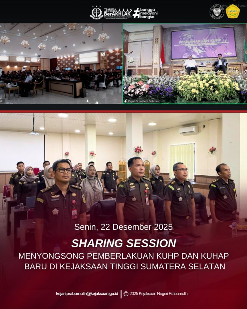 Bertempat di Aula Kejaksaan Negeri Prabumulih, Kepala Sub Bagian Pembinaan Bapak I Ketut Wirasa, S.H., Kepala Seksi Tindak Pidana Umum Bapak Mirsyah Rizal, S.H., M.H., Kepala Seksi Tindak Pidana Khusus Bapak Safe’i, S.H., M.H., Kepala Seksi Pemulihan Aset dan Barang Bukti Bapak Faisyal Basni, S.H., M.H., Para Kepala Sub Seksi dan Jaksa Fungsional di Kejaksaan Negeri Prabumulih mengikuti Kegiatan Sharing Session Menyongsong Pemberlakuan KUHP dan KUHAP Baru di Wilayah Kejaksaan Tinggi Sumatera Selatan.