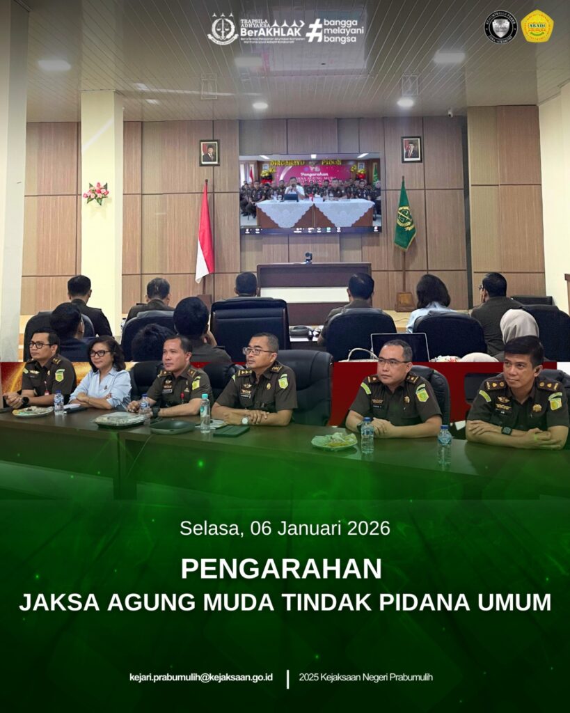 Bertempat di Aula Kantor Kejaksaan Negeri Prabumulih, Plh. Kepala Kejaksaan Negeri Prabumulih Bapak Muhammad Gandara, S.H., M.H., bersama para Kepala Seksi serta Jaksa Fungsional Kejaksaan Negeri Prabumulih mengikuti Pengarahan Jaksa Agung Muda Tindak Pidana Umum terkait pemberlakuan KUHP dan KUHAP Baru, yang dilaksanakan secara daring melalui Zoom Meeting.