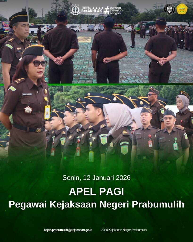 Bertempat di halaman kantor Kejaksaan Negeri Prabumulih Kepala Seksi Bidang Perdata dan Tata Usaha Negara Ibu Erwina Mea Dimatnusa, S.H., M.H. memimpin Apel Rutin Senin Pagi yang diikuti oleh Para Kasi, Kasubagbin, dan seluruh Pegawai Kejaksaan Negeri Prabumulih.