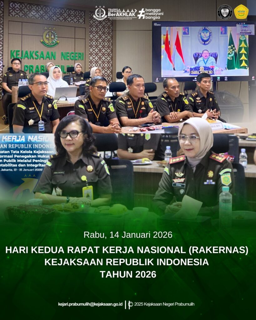 Bertempat di Ruang Pers Kantor Kejaksaan Negeri Prabumulih Kepala Kejaksaan Negeri Prabumulih Ibu Asvera Primadona, S.H.,M.H. bersama para Kepala Seksi dan Kasubag Pembinaan serta pegawai pada Kejaksaan Negeri Prabumulih mengikuti Rapat Kerja Nasional Kejaksaan Republik Indonesia Hari Kedua Tahun 2026 secara daring melalui Zoom Meeting.