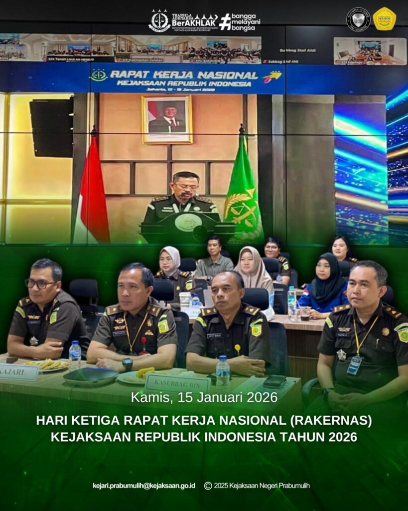 Bertempat di Ruang Pers Kantor Kejaksaan Negeri Prabumulih, para Kepala Seksi, Kepala Subbagian Pembinaan, serta pegawai Kejaksaan Negeri Prabumulih mengikuti Penutupan Rapat Kerja Nasional Kejaksaan Republik Indonesia Tahun 2026 secara daring melalui Zoom Meeting.