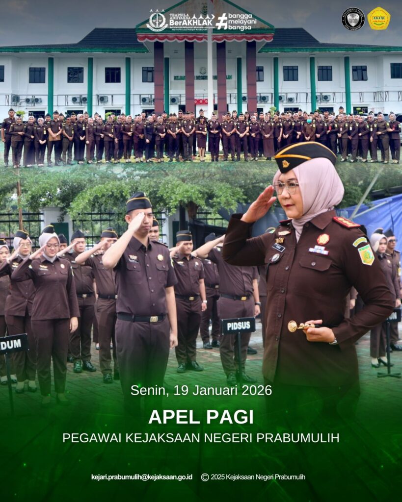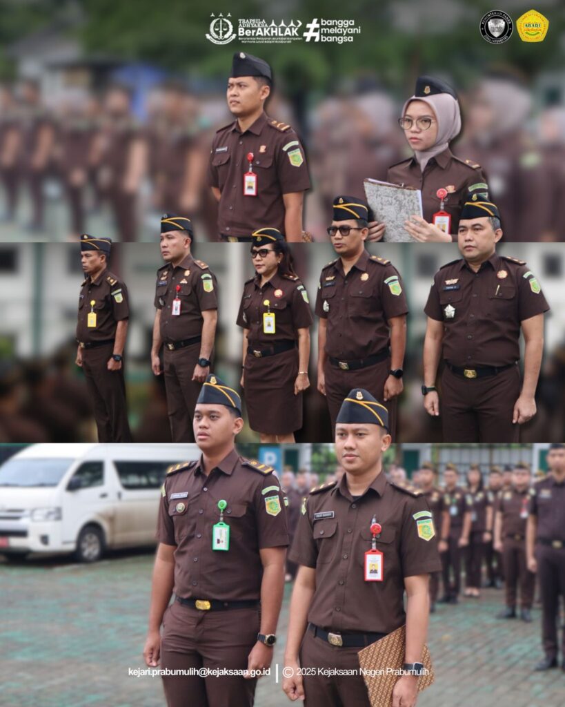 Kepala Kejaksaan Negeri Prabumulih, Ibu Asvera Primadona, S.H., M.H., memimpin Apel Rutin Senin Pagi sekaligus Apel Perdana sejak resmi menjabat sebagai Kepala Kejaksaan Negeri Prabumulih. Kegiatan apel dilaksanakan di halaman Kantor Kejaksaan Negeri Prabumulih dan diikuti oleh para Kepala Seksi serta seluruh pegawai di lingkungan Kejaksaan Negeri Prabumulih.
