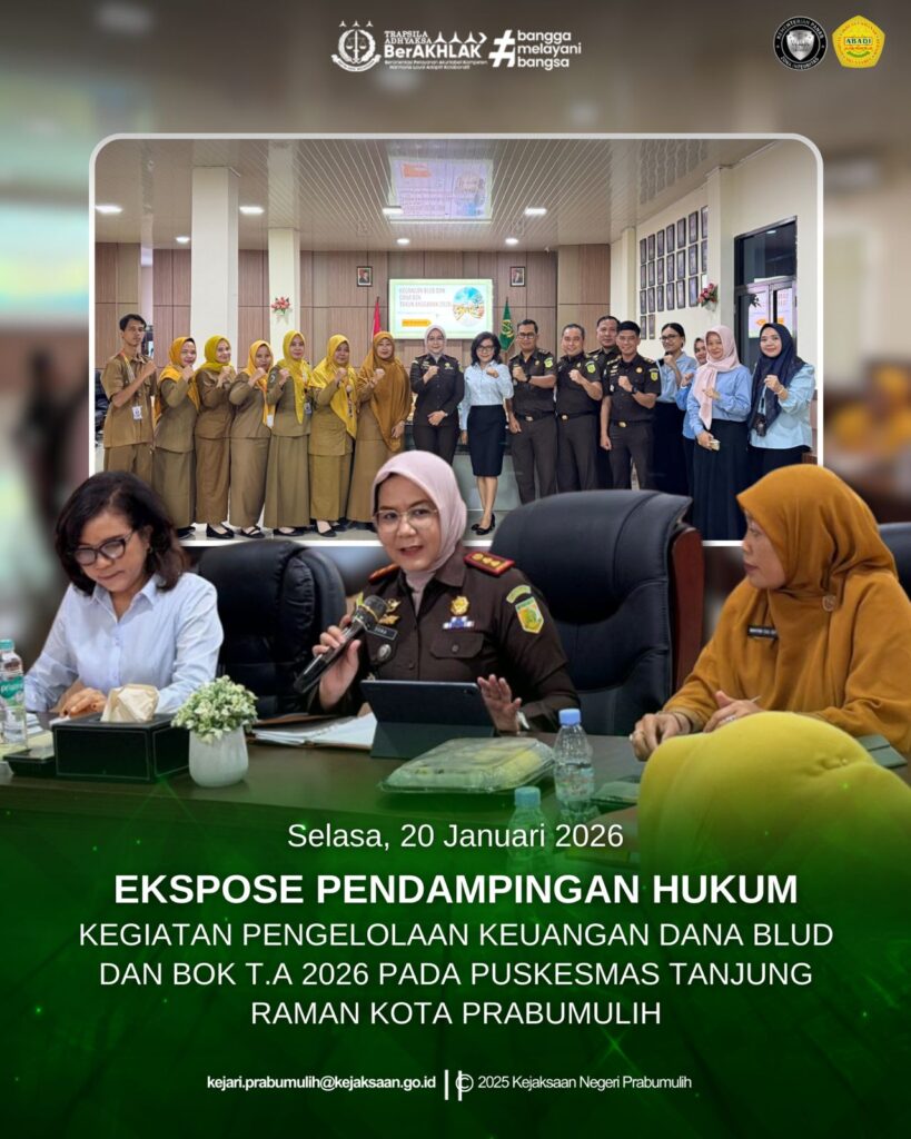 Kepala Kejaksaan Negeri Prabumulih Ibu Asvera Primadona, S.H.,M.H. bersama Kepala Seksi Perdata dan Tata Usaha Negara Ibu Erwina Mea Dimatnusa, S.H,.M.H., Kepala Seksi Tindak Pidana Umum Bapak Mirsyah Rizal S.H.,M.H., Kepala Seksi Intelijen Bapak Adjie Martha, S.H., Kepala Seksi Tindak Pidana Khusus Bapak Syafei, S.H.,M.H., Kepala Seksi Pengelolaan Aset dan Pengelolaan Barang Bukti Bapak Faisyal Basni, S.H.,M.H., beserta para Jaksa Pengacara Negara melakukan Ekspose Pendampingan Hukum Kegiatan Pengelolaan Keuangan Dana BLUD dan BOK TA. 2026 Pada Puskesmas Tanjung Raman, Kota Prabumulih.