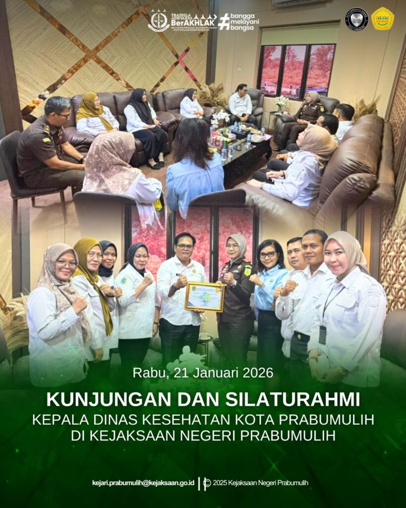 Kepala Dinas Kesehatan Kota Prabumulih Bapak Djoko Lisyano, S.KM., M.Si., beserta jajaran melaksanakan kunjungan silaturahmi ke Kejaksaan Negeri Prabumulih dan disambut langsung oleh Kepala Kejaksaan Negeri Prabumulih Ibu Asvera Primadona, S.H., M.H., bersama para Kepala Seksi dan Kasubagbin Kejaksaan Negeri Prabumulih.