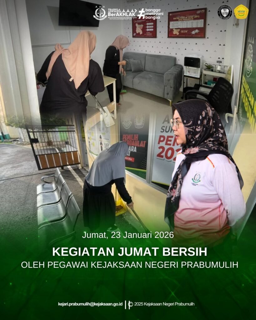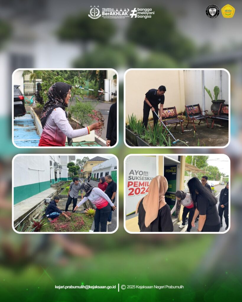 Pegawai Kejaksaan Negeri Prabumulih melaksanakan kegiatan Jumat Bersih di lingkungan kantor Kejaksaan Negeri Prabumulih yang dipantau langsung oleh Kepala Kejaksaan Negeri Prabumulih Ibu Asvera Primadona, S.H., M.H.