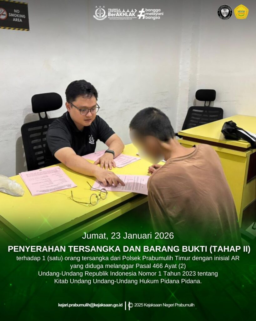 Bertempat di Ruang Tahap II Kantor Kejaksaan Negeri Prabumulih telah dilaksanakan Penyerahan tersangka dan barang bukti (Tahap II) terhadap 1 (satu) orang tersangka dari Polsek Prabumulih Timur dengan inisial AR yang diduga melanggar Pasal 466 Ayat (2) Undang-Undang Republik Indonesia Nomor 1 Tahun 2023 tentang Kitab Undang Undang-Undang Hukum Pidana Pidana.