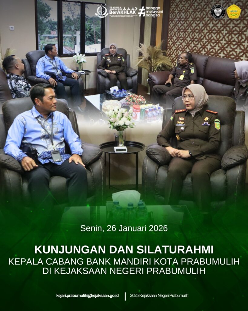 Kepala Kejaksaan Negeri Prabumulih, Ibu Asvera Primadona, S.H., M.H., bersama Kasubagbin menerima kunjungan silaturahmi Kepala Cabang Bank Mandiri Kota Prabumulih Bapak Doni Rivoli beserta jajaran, pertemuan ini sebagai bentuk awal yang baik dalam mempererat hubungan kelembagaan serta meningkatkan koordinasi dan sinergi antar instansi.