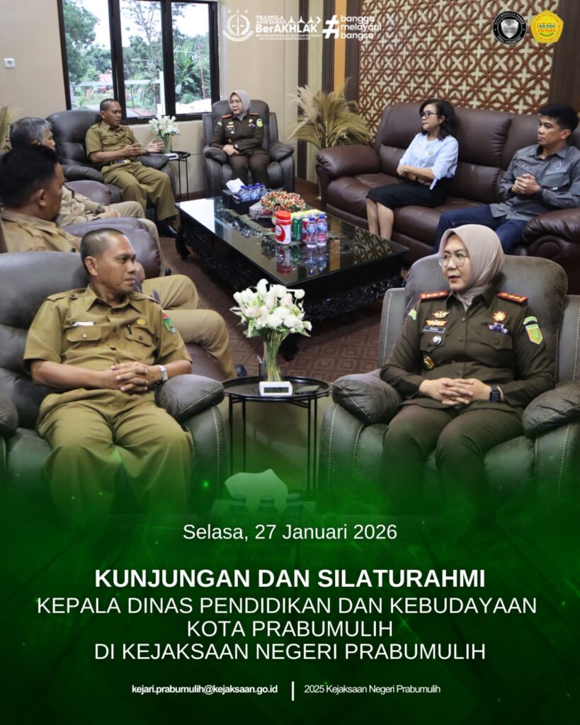 Kepala Dinas Pendidikan dan Kebudayaan Kota Prabumulih, Bapak A. Darmadi, S.Pd., M.Si., melaksanakan kunjungan silaturahmi ke Kejaksaan Negeri Prabumulih dan disambut langsung oleh Kepala Kejaksaan Negeri Prabumulih Ibu Asvera Primadona, S.H., M.H., bersama para Kepala Seksi Kejaksaan Negeri Prabumulih.