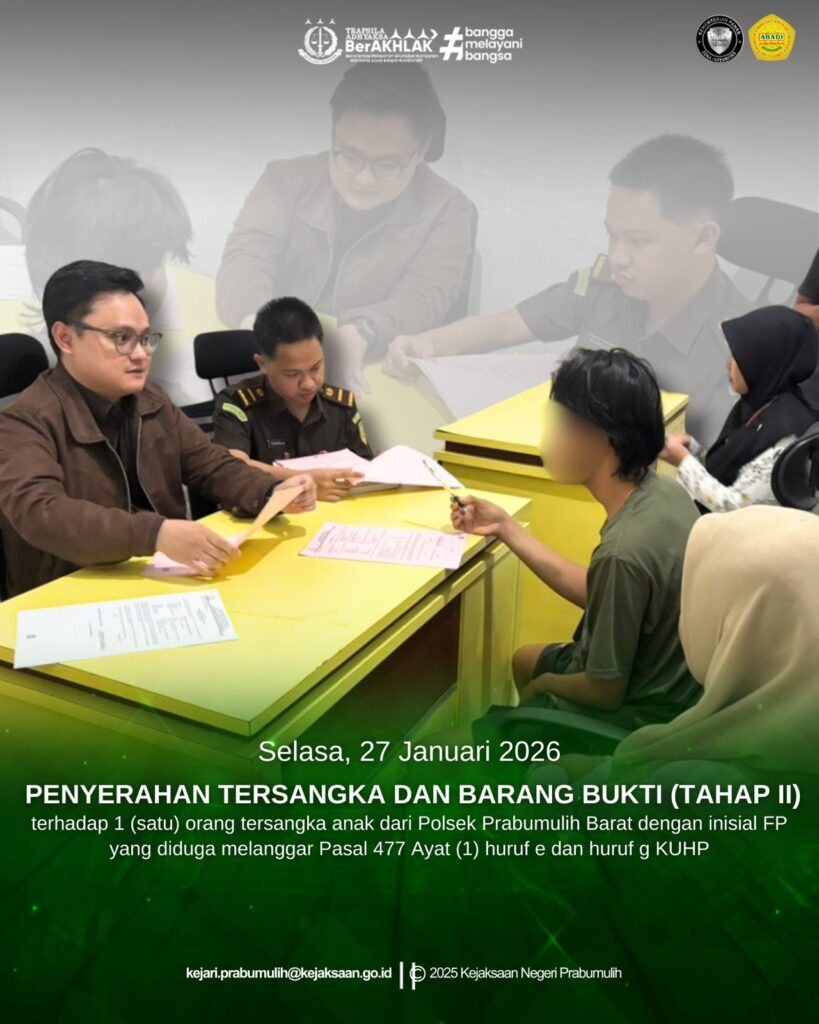 Bertempat di Ruang Tahap II Kantor Kejaksaan Negeri Prabumulih telah dilaksanakan Penyerahan Tersangka dan Barang Bukti (Tahap II) terhadap 1 (satu) orang tersangka anak dari Polsek Prabumulih Barat dengan inisial FP yang diduga melanggar Pasal 477 Ayat (1) huruf e dan huruf g KUHP.
