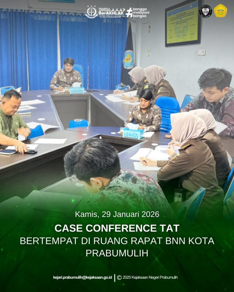 Kejaksaan Negeri Prabumulih menghadiri undangan Case Conference TAT yang dilaksanakan di Ruang Rapat BNN Kota Prabumulih. Kegiatan tersebut dihadiri oleh Kasubsi Penuntutan Tindak Pidana Umum Ibu Khiluwa Nadhifah, S.H., sebagai wujud sinergi antar penegak hukum dalam penanganan perkara narkotika secara komprehensif dan terpadu.