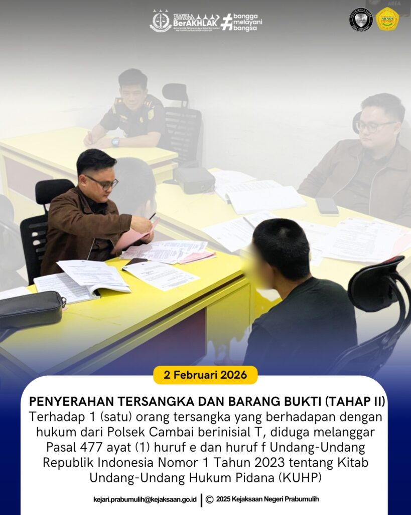 Bertempat di Ruang Tahap II Kantor Kejaksaan Negeri Prabumulih, telah dilaksanakan Penyerahan Tersangka dan Barang Bukti (Tahap II) terhadap 1 (satu) orang tersangka yang berhadapan dengan hukum dari Polsek Cambai, berinisial T.