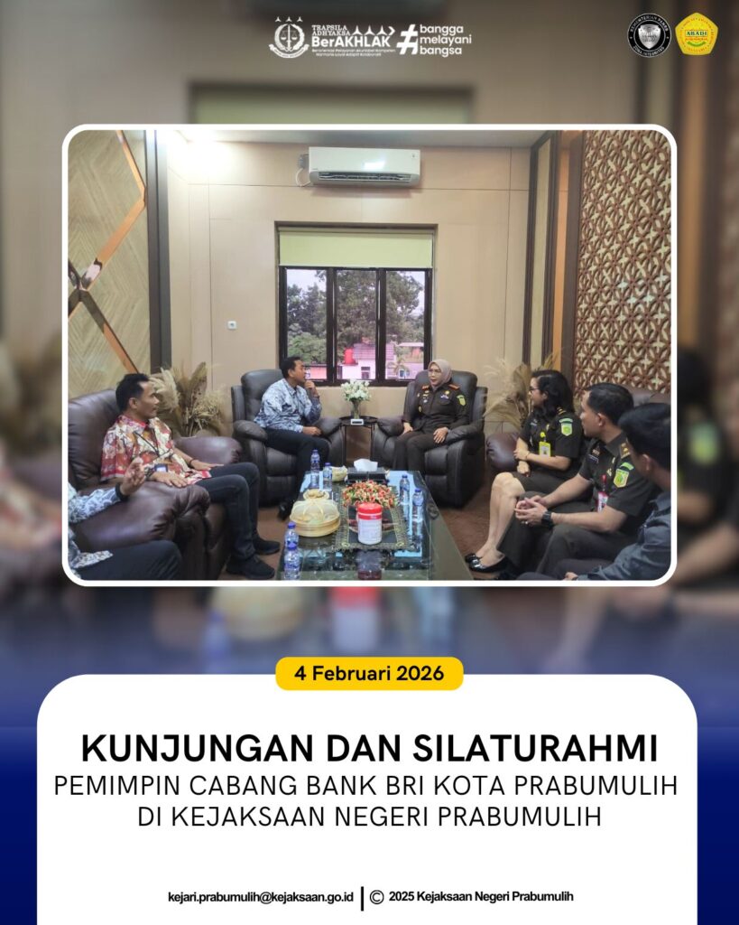 Pemimpin Cabang Bank BRI Kota Prabumulih Bapak R.P Rafi Rafsanjani beserta jajaran melaksanakan kunjungan silaturahmi ke Kejaksaan Negeri Prabumulih. Kunjungan tersebut disambut langsung oleh Kepala Kejaksaan Negeri Prabumulih Ibu Asvera Primadona, S.H., M.H., bersama para Kepala Seksi Kejaksaan Negeri Prabumulih.