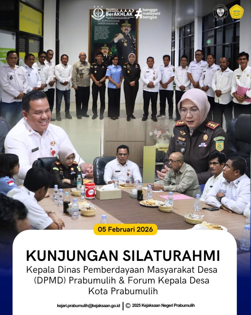 Kepala Kejaksaan Negeri Prabumulih Ibu Asvera Primadona, S.H.,M.H., didampingi Kepala Sekssi Intelijen Bapak Ajie Martha, S.H., dan Kepala Seksi Perdata dan Tata Usaha Negera Ibu Erwina Mea Dimatnusa, S.H.,M.H., menerima Kunjungan Silaturahmi Kepala Dinas Pemberdayaan Masyarakat Desa (DPMD) Kota Prabumulih & Forum Kepala Desa Kota Prabumulih.