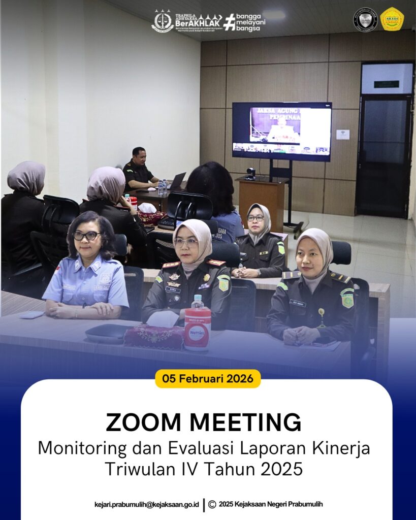 Kepala Kejaksaan Negeri Prabumulih Ibu Asvera Primadona, S.H.,M.H., bersama Plh.Kasubag Pembinaan Ibu Erwina Mea Dimatnusa, S.H.,M.H., beserta staf pada bagian Pembinaan mengikuti Monitoring dan Evaluasi Laporan Kinerja Triwulan IV Tahun 2025.