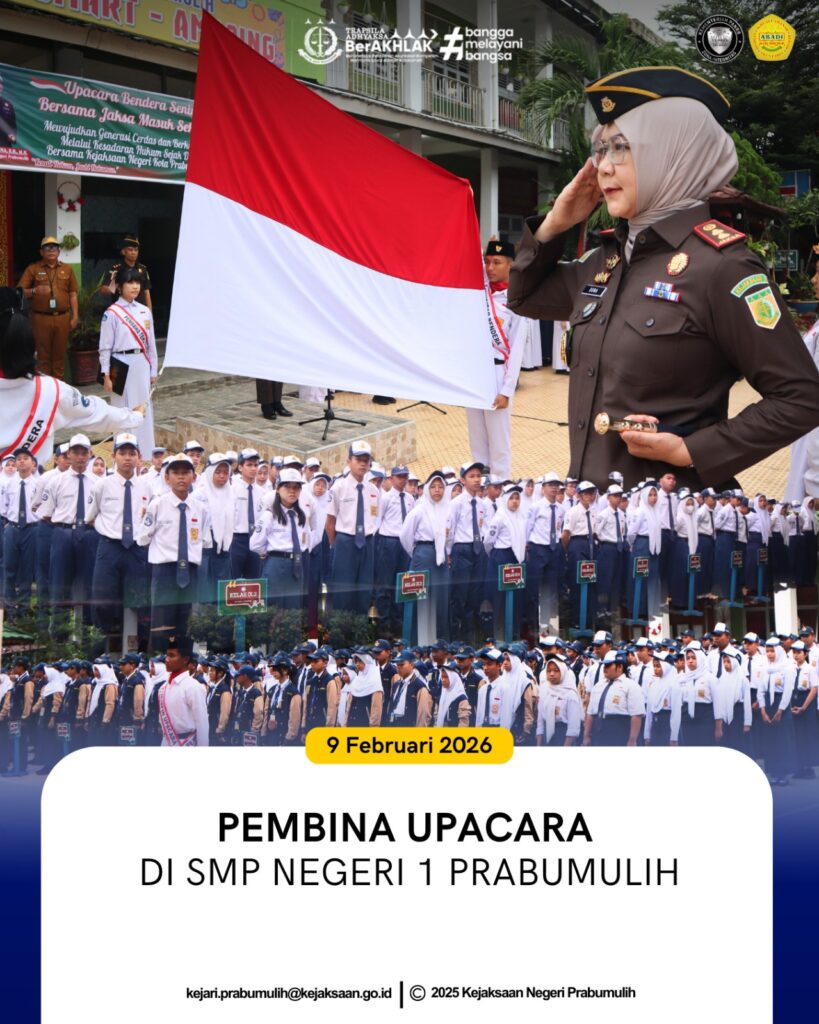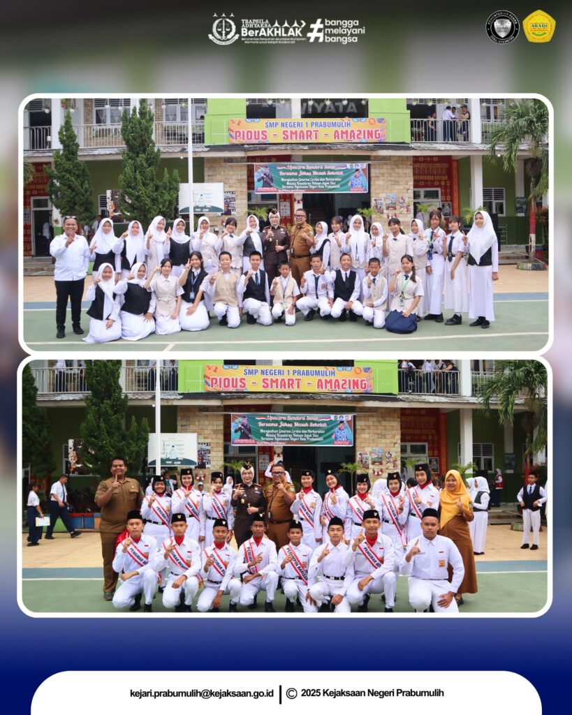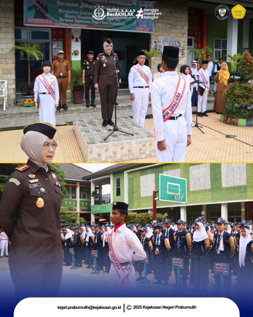 Bertempat di lapangan SMPN 1 Prabumulih Kepala Kejaksaan Negeri Prabumulih Ibu Asvera Primadona, S.H., M.H., Didampingi Kepala Seksi Intelijen Bapak Ajie Martha, S.H., menjadi Pembina Upacara di SMP Negeri 1 Prabumulih yang diikuti Para guru dan seluruh siswa SMPN 1 Prabumulih.