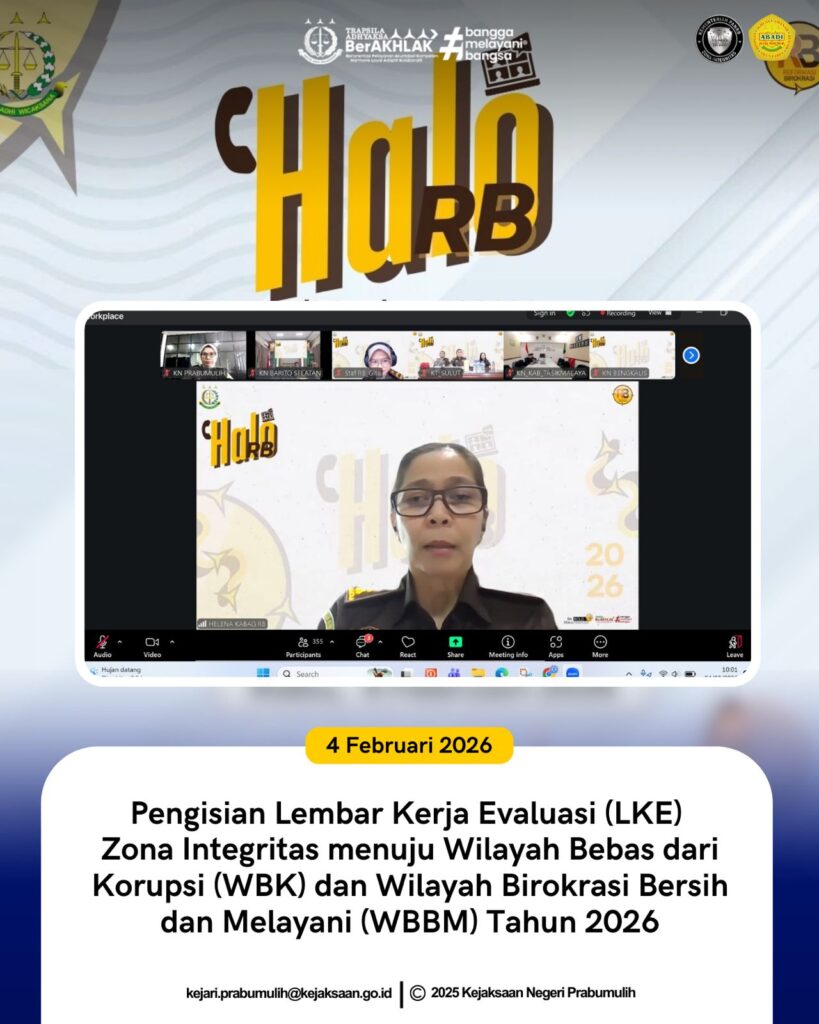 Sekretaris Tim Zona Integritas Kejaksaan Negeri Prabumulih Bapak Marfel Agustian, S.Kom., beserta Tim IT Kejaksaan Negeri Prabumulih mengikuti kegiatan Pengisian Lembar Kerja Evaluasi (LKE) Zona Integritas menuju Wilayah Bebas dari Korupsi (WBK) dan Wilayah Birokrasi Bersih dan Melayani (WBBM) Tahun 2026 yang dilaksanakan secara daring melalui media Zoom Meeting.