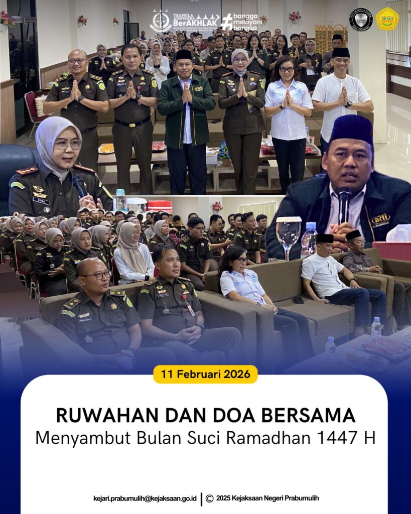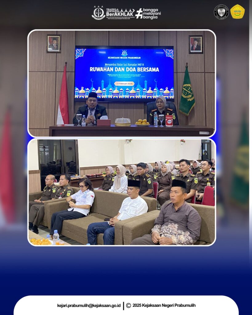 Bertempat di Aula Kejaksaan Negeri Prabumulih, telah dilaksanakan kegiatan Ruwahan dan Doa Bersama dalam rangka menyambut Bulan Suci Ramadhan 1447 H yang diikuti oleh Kepala Kejaksaan Negeri Prabumulih Ibu Asvera Primadona, S.H., M.H., bersama Pejabat Struktural serta seluruh pegawai Kejaksaan Negeri Prabumulih.