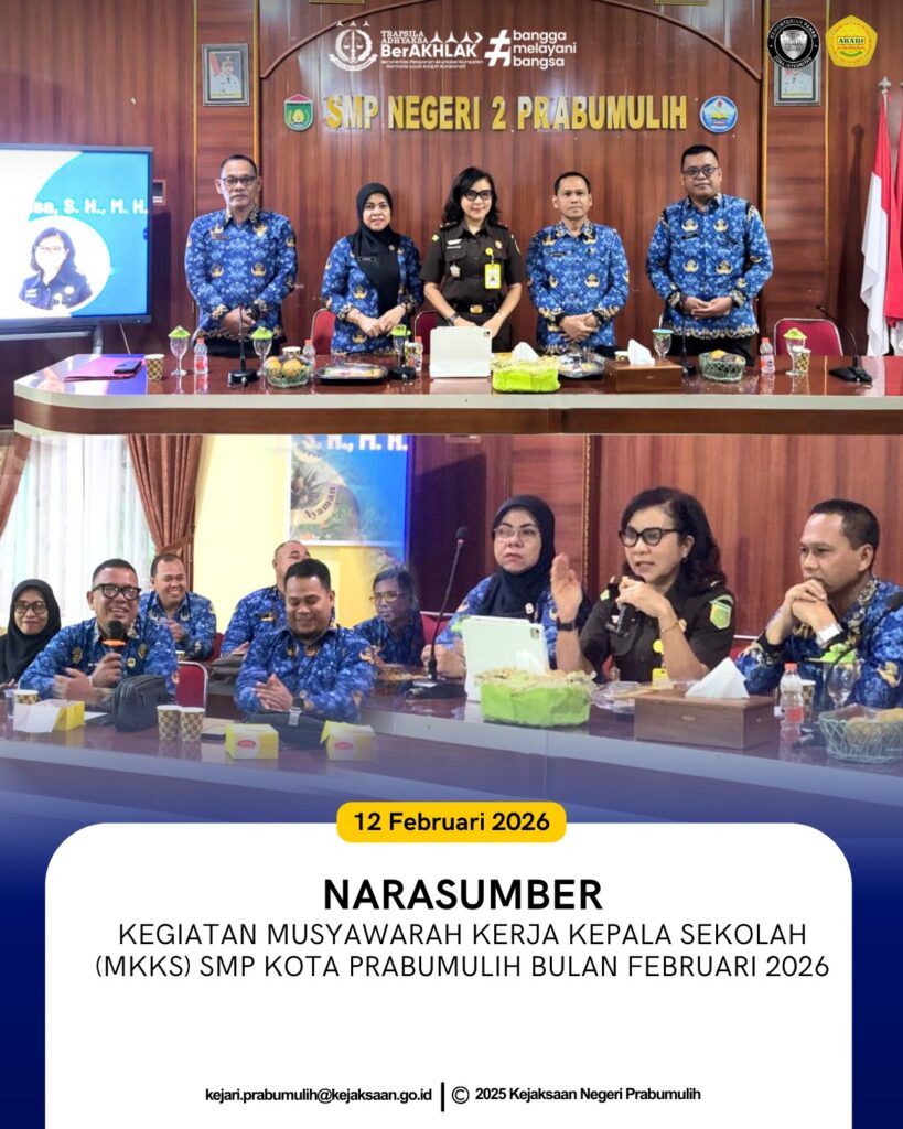 Bertempat di Aula SMP Negeri 2 Prabumulih, Kepala Seksi Perdata dan Tata Usaha Negara Kejaksaan Negeri Prabumulih, Ibu Erwina Mea Dimatnusa, S.H., M.H., menjadi narasumber pada kegiatan Musyawarah Kerja Kepala Sekolah (MKKS) SMP Kota Prabumulih bulan Februari 2026.