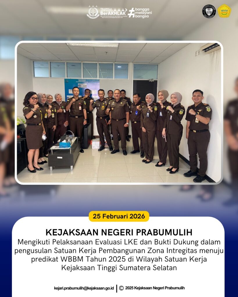 Bertempat di Kejaksaan Tinggi Sumatera Selatan, Ketua Tim WBBM Kejaksaan Negeri Prabumulih Ibu Erwina Mea Dimatnusa, S.H., M.H., beserta anggota mengikuti kegiatan evaluasi Lembar Kerja Evaluasi (LKE) dan bukti dukung dalam rangka pengusulan Satuan Kerja Pembangunan Zona Integritas menuju predikat Wilayah Birokrasi Bersih dan Melayani (WBBM) Tahun 2026.