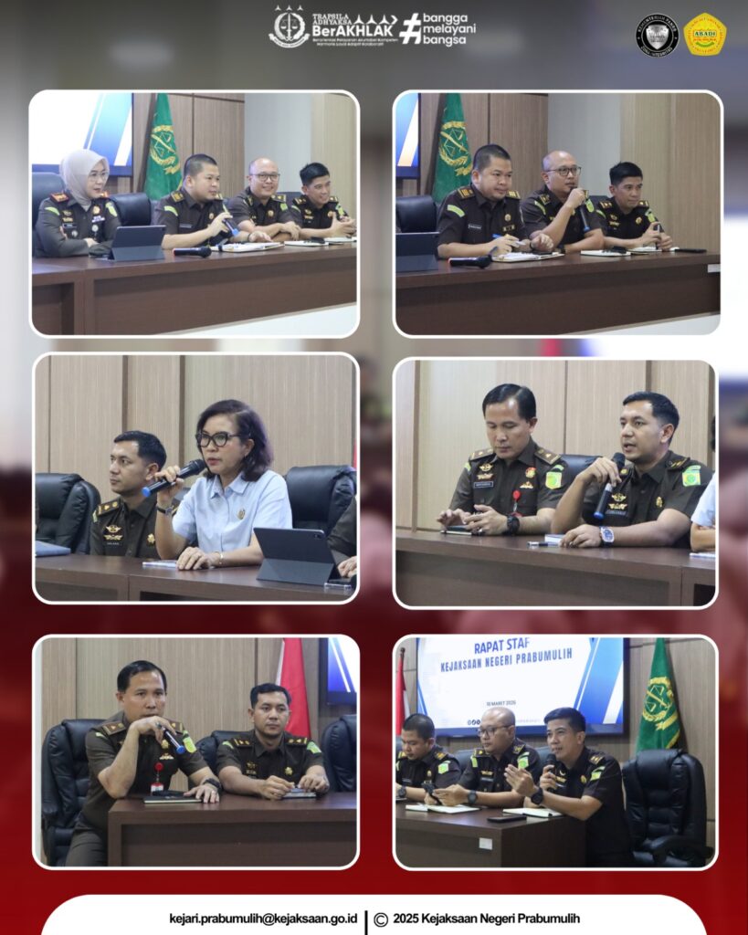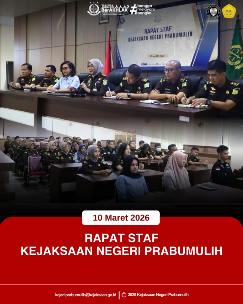 Bertempat di Aula Kejaksaan Negeri Prabumulih, Kepala Kejaksaan Negeri Prabumulih Ibu Asvera Primadona, S.H., M.H., memimpin Rapat Staf yang diikuti oleh para Pejabat Struktural serta seluruh pegawai di lingkungan Kejaksaan Negeri Prabumulih. Rapat tersebut dilaksanakan dalam rangka evaluasi pelaksanaan tugas serta peningkatan kinerja dan koordinasi antar bidang di lingkungan Kejaksaan Negeri Prabumulih.