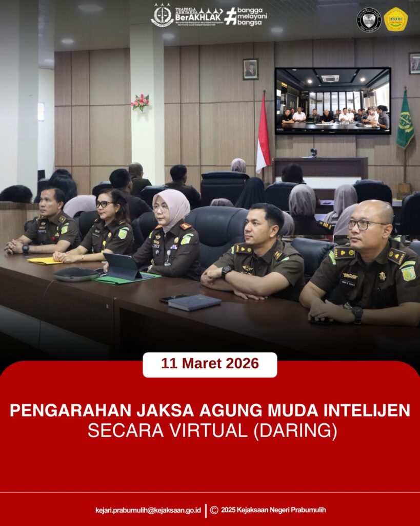 Bertempat di Aula Kantor Kejaksaan Negeri Prabumulih, Kepala Kejaksaan Negeri Prabumulih Ibu Asvera Primadona, S.H., M.H. bersama para Pejabat Struktural serta seluruh pegawai pada Kejaksaan Negeri Prabumulih mengikuti Pengarahan Jaksa Agung Muda Intelijen secara virtual.