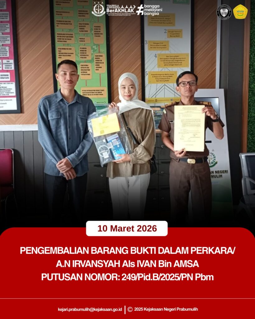 Kejari Prabumulih pada Bidang Pemulihan Aset dan Pengelolaan Barang Bukti (PAPBB) telah melaksanakan Pengembalian Barang Bukti berdasarkan Putusan PN Prabumulih Nomor: 249/Pid.B/2025/PN Pbm a.n.Terpidana Irvansyah Als Ivan Bin Amsa, berupa: