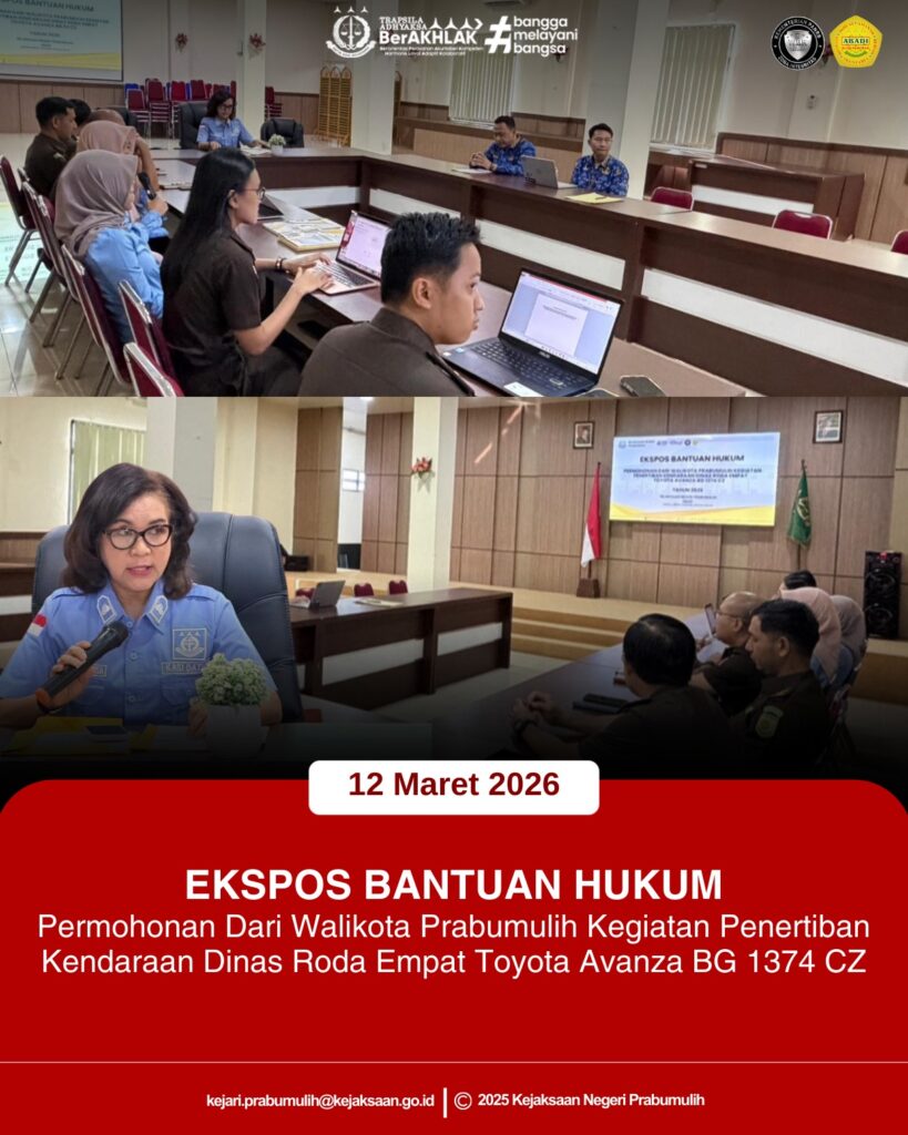 Bertempat di Aula Kejaksaan Negeri Prabumulih, Kepala Seksi Perdata dan Tata Usaha Negara, Ibu Erwina Mea Dimatnusa, S.H., M.H., memimpin kegiatan ekspose permohonan bantuan hukum dari Wali Kota Prabumulih terkait kegiatan penertiban kendaraan dinas roda empat Toyota Avanza dengan nomor polisi BG 1374 CZ