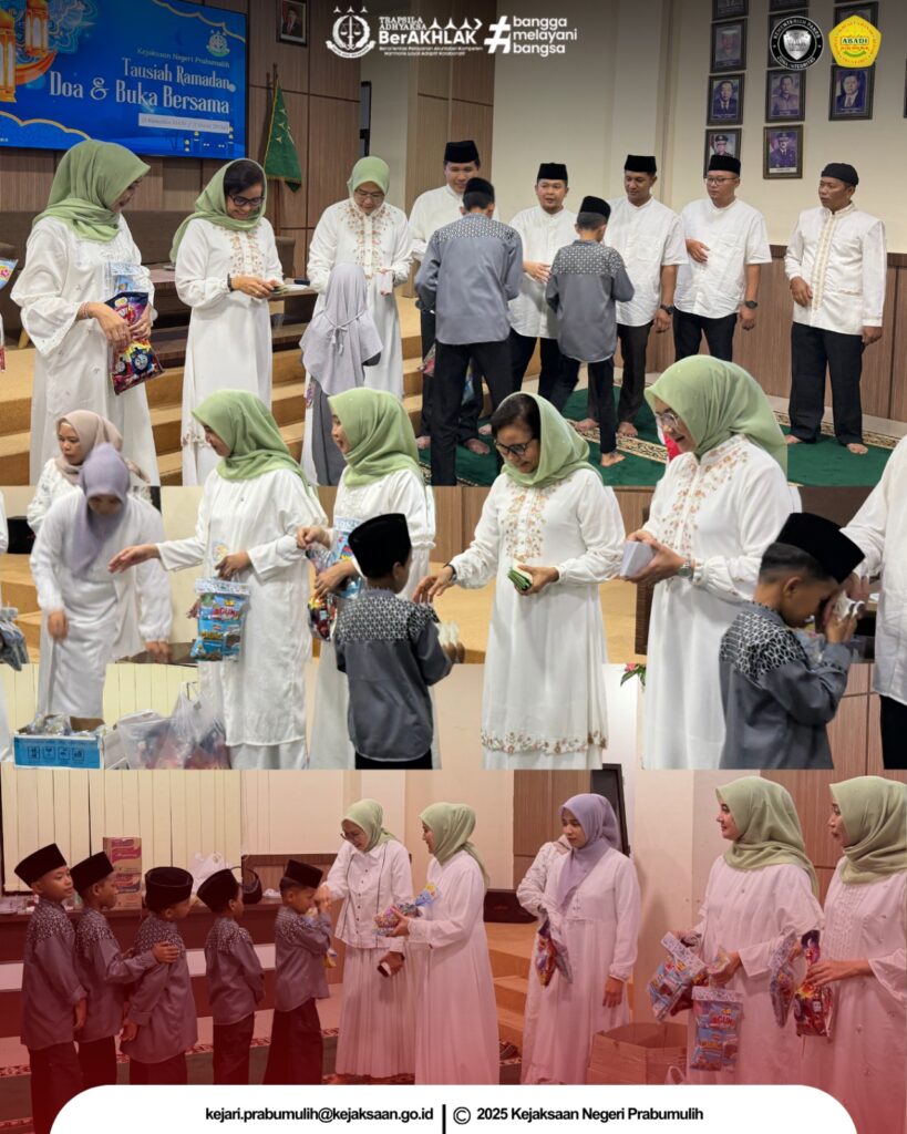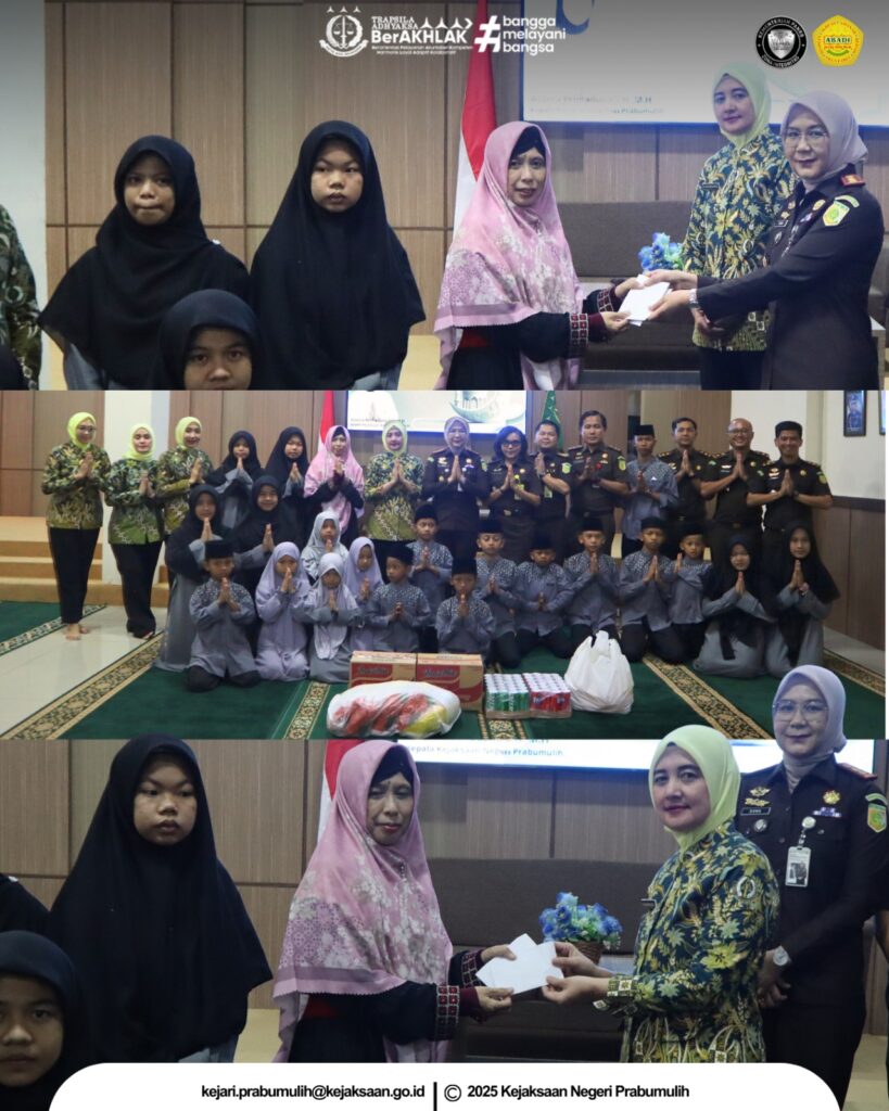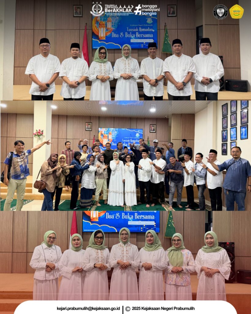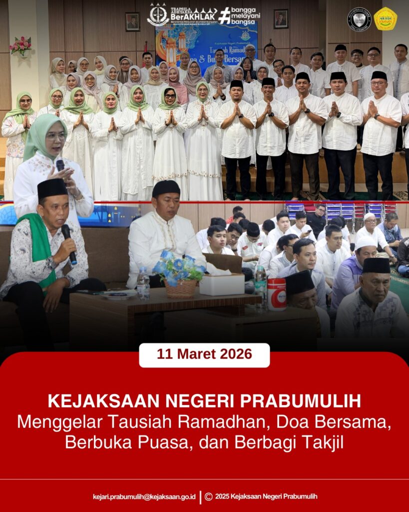 Bertempat di Aula Kantor Kejaksaan Negeri Prabumulih, Kepala Kejaksaan Negeri Prabumulih Ibu Asvera Primadona, S.H., M.H., beserta seluruh pegawai Kejaksaan Negeri Prabumulih melaksanakan kegiatan Tausiah Ramadhan, Doa Bersama, Berbuka Puasa Bersama, serta Berbagi Takjil dan santunan sebagai bentuk mempererat kebersamaan dan meningkatkan nilai-nilai spiritual di bulan suci Ramadhan.