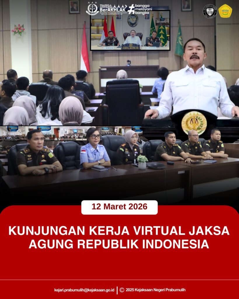 Bertempat di Aula Kantor Kejaksaan Negeri Prabumulih, Kepala Kejaksaan Negeri Prabumulih Ibu Asvera Primadona, S.H., M.H. bersama para Pejabat Struktural serta seluruh pegawai di lingkungan Kejaksaan Negeri Prabumulih mengikuti Kunjungan Kerja Virtual Jaksa Agung Republik Indonesia.