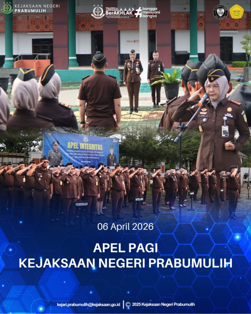 Bertempat di halaman Kantor Kejaksaan Negeri Prabumulih, Kepala Kejaksaan Negeri Prabumulih Ibu Asvera Primadona, S.H., M.H., memimpin Apel Rutin Senin Pagi yang diikuti oleh para Kepala Seksi serta seluruh pegawai di lingkungan Kejaksaan Negeri Prabumulih.