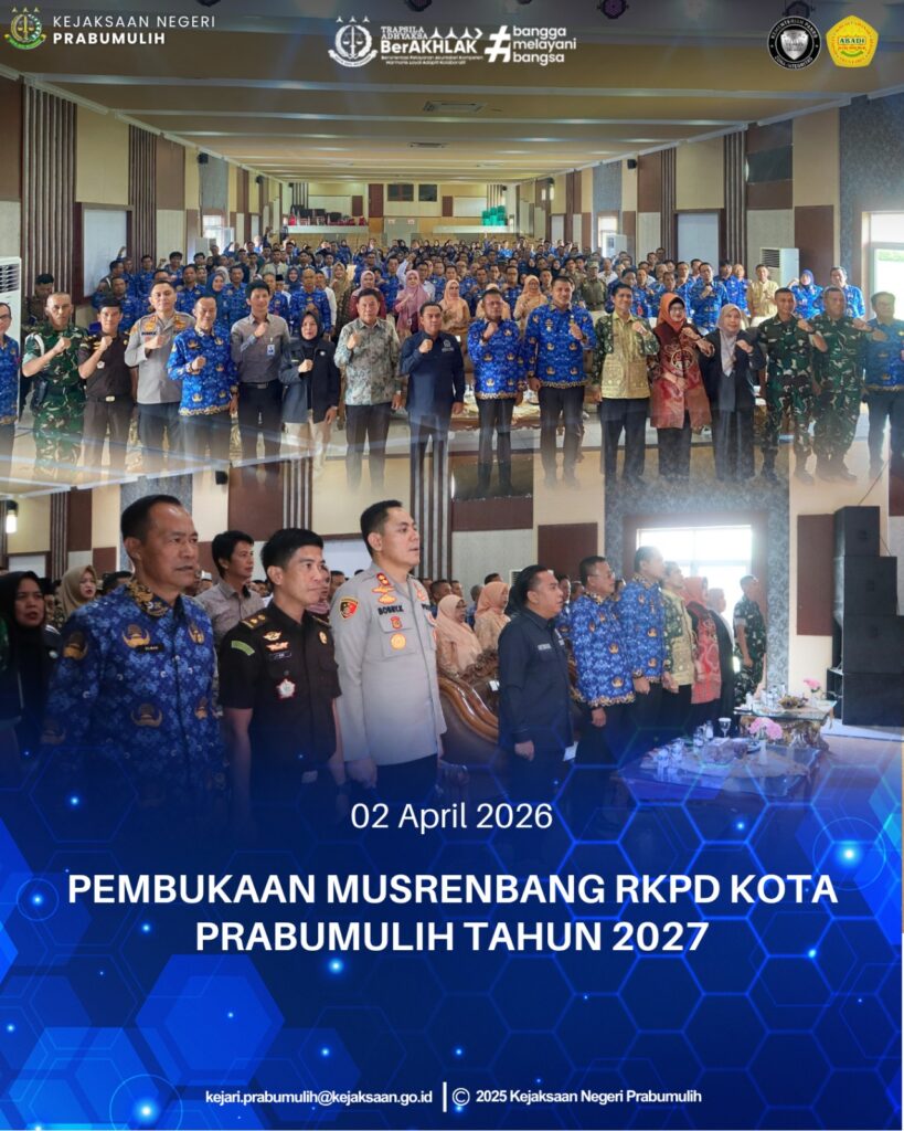 Bertempat di Gedung Kesenian Rumah Dinas Walikota Prabumulih, Kepala Kejaksaan Negeri Prabumulih yang diwakili oleh Kepala Seksi Intelijen Bapak Ajie Martha, S.H., menghadiri kegiatan Pembukaan Musyawarah Perencanaan Pembangunan (Musrenbang) RKPD Kota Prabumulih Tahun 2027.