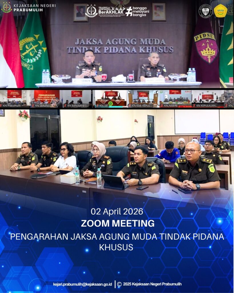 Bertempat di Aula Kantor Kejaksaan Negeri Prabumulih, Kepala Kejaksaan Negeri Prabumulih Ibu Asvera Primadona, S.H., M.H. bersama para Pejabat Struktural serta Jaksa Fungsional pada Kejaksaan Negeri Prabumulih mengikuti Pengarahan Jaksa Agung Muda Tindak Pidana Khusus secara Virtual.