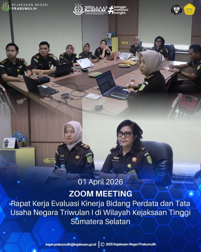 Bertempat di Ruang Rapat Kejaksaan Negeri Prabumulih, Kepala Seksi Perdata dan Tata Usaha Negara Kejaksaan Negeri Prabumulih, Ibu Erwina Mea Dimatnusa, S.H., M.H., beserta jajaran staf pada Bidang Perdata dan Tata Usaha Negara mengikuti Rapat Kerja Evaluasi Kinerja Triwulan I Bidang Perdata dan Tata Usaha Negara se-Wilayah Kejaksaan Tinggi Sumatera Selatan. Kegiatan tersebut dilaksanakan secara daring melalui Zoom Meeting.