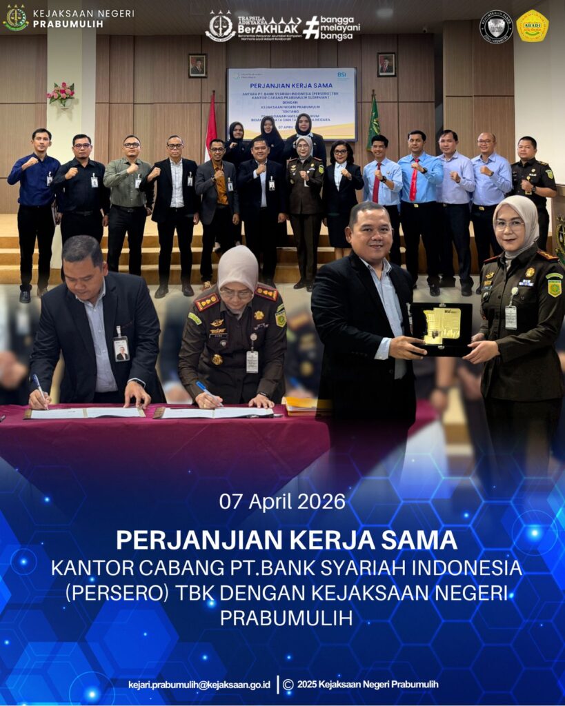 Bertempat di Aula Kantor Kejaksaan Negeri Prabumulih, telah dilaksanakan penandatanganan Perjanjian Kerja Sama antara PT Bank Syariah Indonesia (Persero) Tbk Kantor Cabang Prabumulih dengan Kejaksaan Negeri Prabumulih.