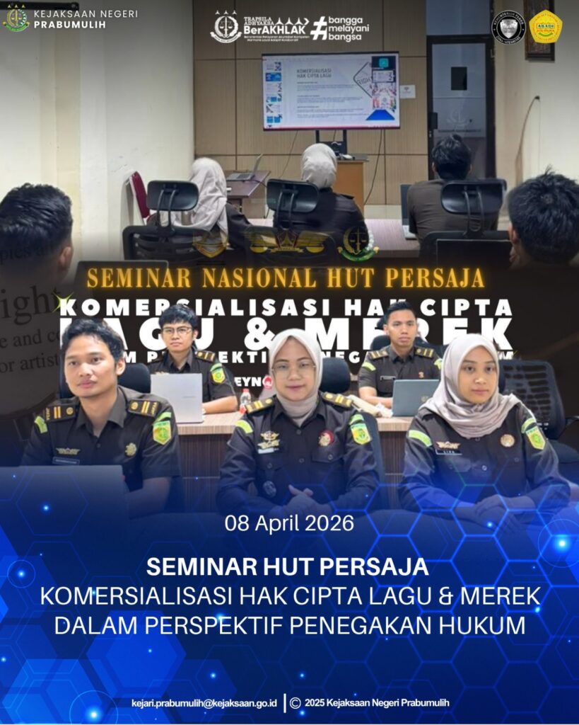 Bertempat di Ruang Pers Kantor Kejaksaan Negeri Prabumulih, Kasubsi Pra Penuntutan, Kasubsi Penuntutan Upaya Hukum Luar Biasa, serta Jaksa Fungsional pada Kejaksaan Negeri Prabumulih mengikuti Seminar Nasional dalam rangka HUT Persaja dengan tema “Komersialisasi Hak Cipta Lagu dan Merek dalam Perspektif Penegakan Hukum.” Kegiatan tersebut dilaksanakan secara daring melalui Zoom Meeting.