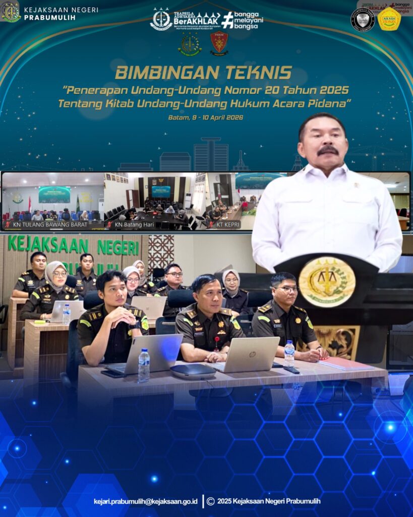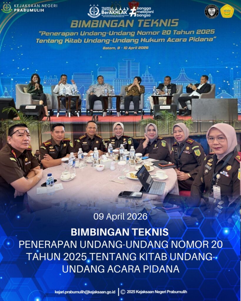 Kepala Kejaksaan Negeri Prabumulih Ibu Asvera Primadona, S.H., M.H., menghadiri secara langsung kegiatan Bimbingan Teknis “Penerapan Undang-Undang Nomor 20 Tahun 2025 tentang Kitab Undang-Undang Hukum Acara Pidana (KUHAP)” yang diselenggarakan di Batam pada tanggal 9–10 April 2026. Kegiatan ini menjadi momentum strategis dalam meningkatkan pemahaman serta kesiapan aparatur penegak hukum dalam menghadapi dinamika dan implementasi KUHAP terbaru.